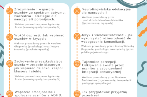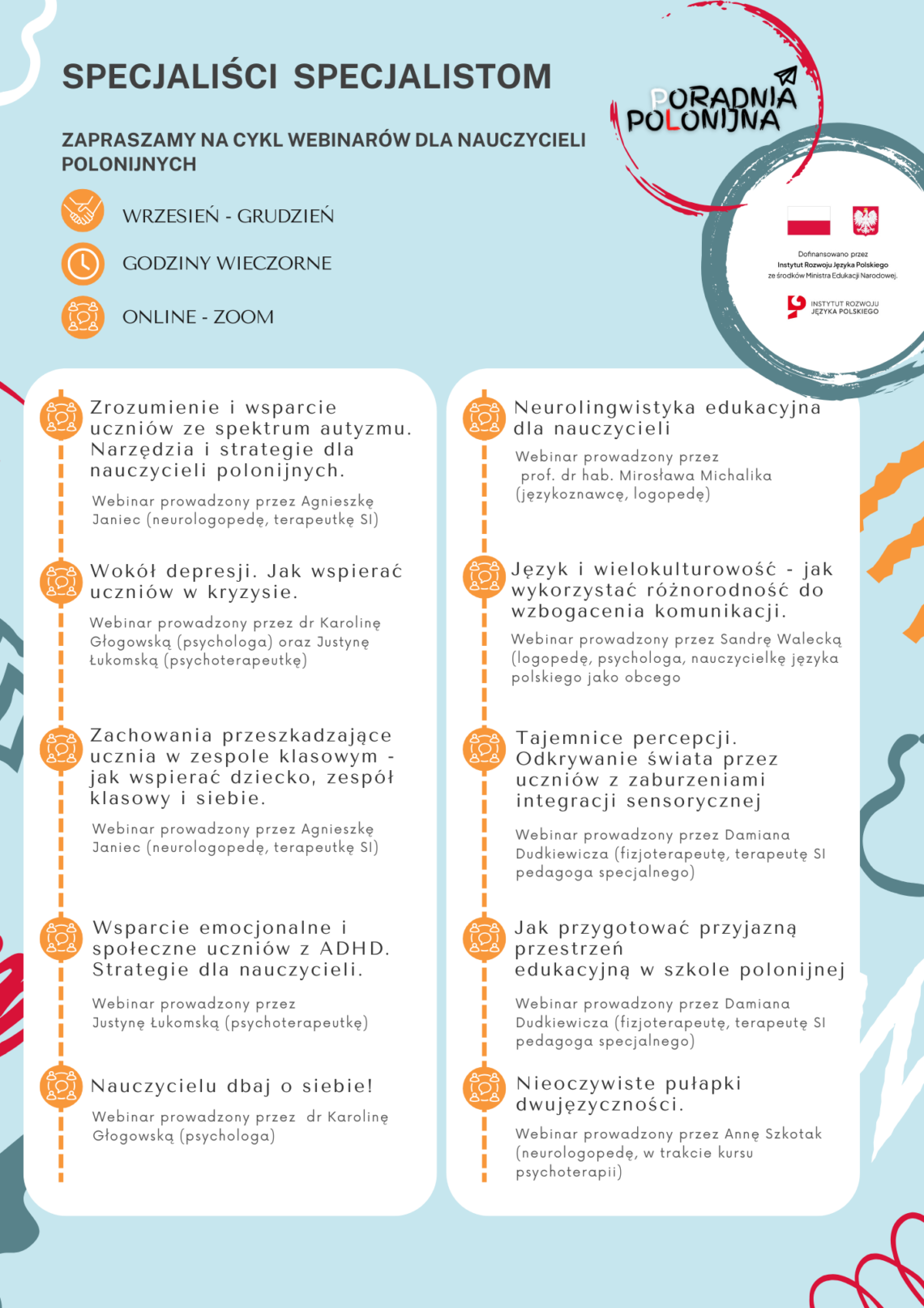 Projekt „Specjaliści Specjalistom” realizowany jest dzięki dofinansowaniu Instytutu Rozwoju Języka Polskiego im. św. Maksymiliana Marii Kolbego w ramach konkursu „Podnoszenie kwalifikacji nauczycieli polonijnych za granicą” Celem konkursu jest poprawa jakości i efektywności nauczania języka polskiego poza granicami kraju, poprzez wspieranie rozwoju zawodowego nauczycieli pracujących w szkołach polonijnych i organizacjach edukacyjnych. Działania muszą obejmować praktyczne formy kształcenia – szkolenia, warsztaty, kursy – m.in. z zakresu nowoczesnych metod nauczania, logopedii, wielojęzyczności, wsparcia psychologicznego i pracy z uczniem o specjalnych potrzebach. „Specjaliści Specjalistom” to cykl specjalistycznych webinarów online, kierowanych do nauczycieli polonijnych na całym świecie. Ich celem jest dostarczenie praktycznych narzędzi i wiedzy wspierającej codzienną pracę – zwłaszcza w obszarach: Webinary prowadzone są przez doświadczonych specjalistów: logopedów, psychologów, terapeutów SI, pedagogów i…